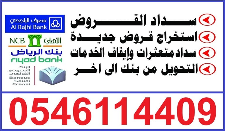 سدد قرضك القديم واستخرج قرض جديد نحن مكتب تسديد قروض واستخراج قرض جديد كما يوجد لدينا خدمه سداد المتعثرات وايقاف الخدمانت وسداد البطاقات الائتمانيه يوجد لدينا فروع في جميع المناطق نتعامل مع قطاع العسكريين والحكومي والشركات المعتمده لدي البنك.
